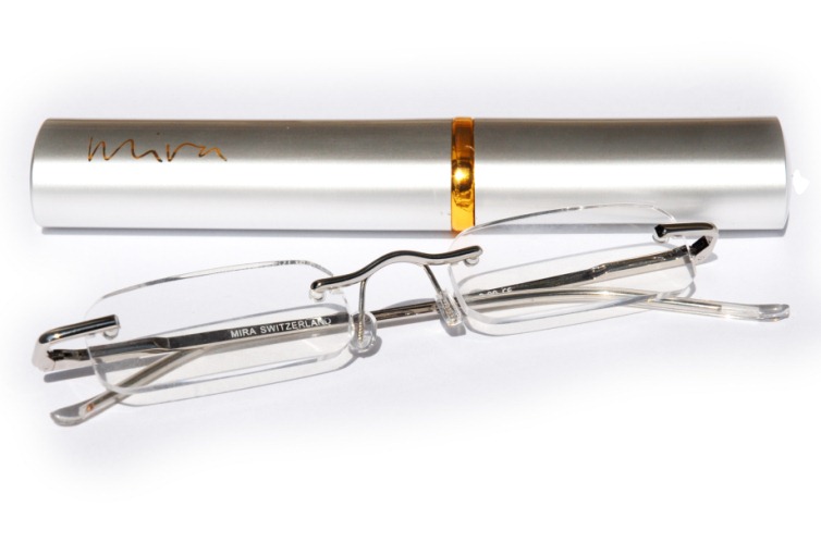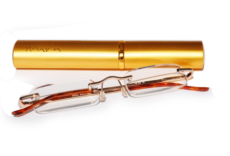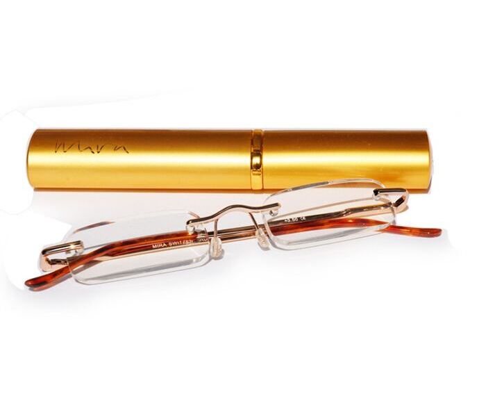 - High-quality, rimless, metal reading glasses with flex hinges.