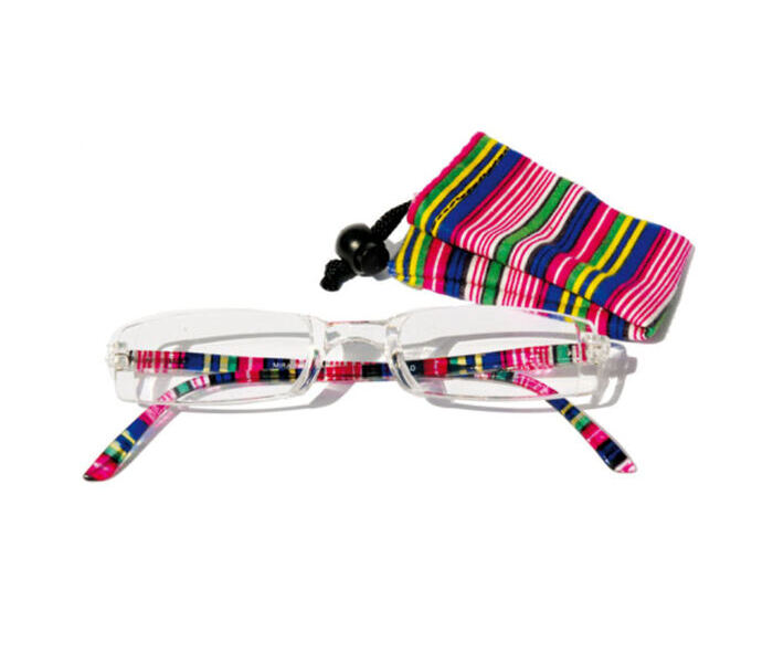 - One-piece acrylic reading glasses with fashionable, color-patterned temples and matching fabric case.